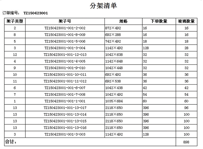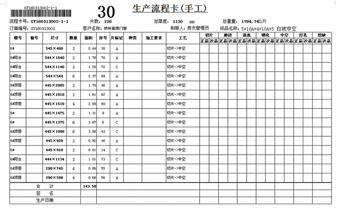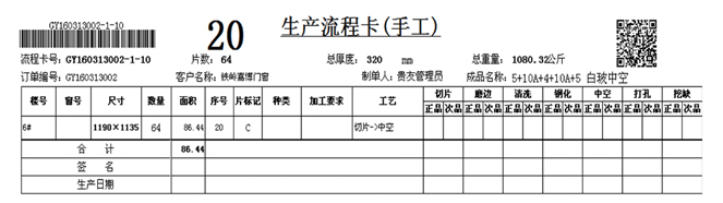 7、打印流程卡,可根据设置的条件将玻璃分架打印流程卡;可将零散玻璃放到一个流程卡内进行生产,将数量多的玻璃放到一个流程卡内进行生产,并统计出共多少流程卡。
